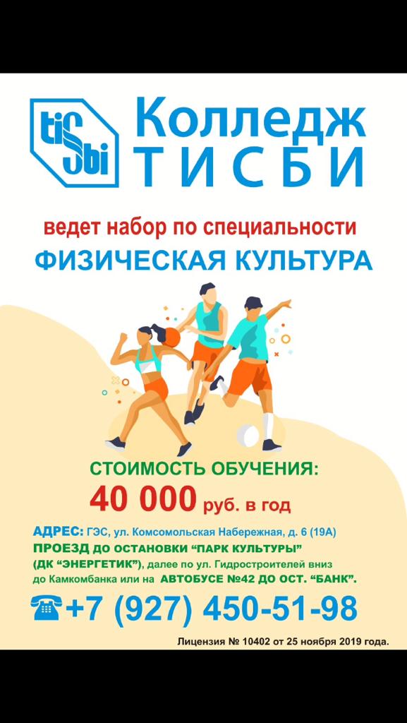 Уважаемые родители и спортсмены! Набережночелнинский филиал Университета управления ТИСБИ и колледж "ТИСБИ" ведет набор по специальности "ФИЗИЧЕСКАЯ КУЛЬТУРА" на базе 9 и 11 классов. Действует скидочная система оплаты обучения, до 20% на первый год обучения, в течении последующих лет обучения скидки за спортивные достижения, а также кандидатам спортивных сборных команд РТ и РФ.