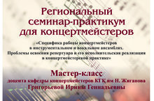 28 января в ДМШ №1 состоялся Региональный семинар-практикум для концертмейстеров «Специфика работы концертмейстера в инструментальном и вокальном ансамблях. Проблемы освоения репертуара и его исполнительская реализация в концертмейстерской практике» и мастер-класс доцента кафедры концертмейстеров КГК им. Н.Жиганова Григорьевой Ирины Геннадьевны