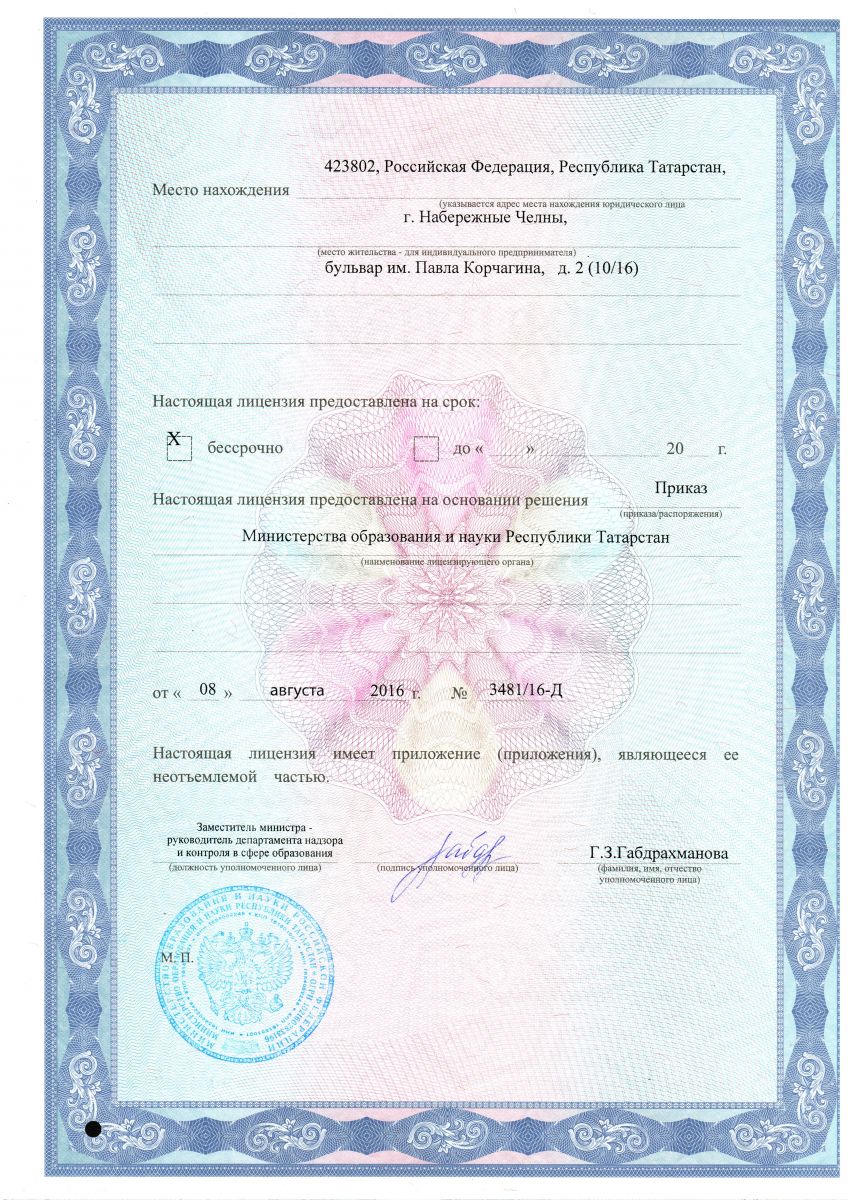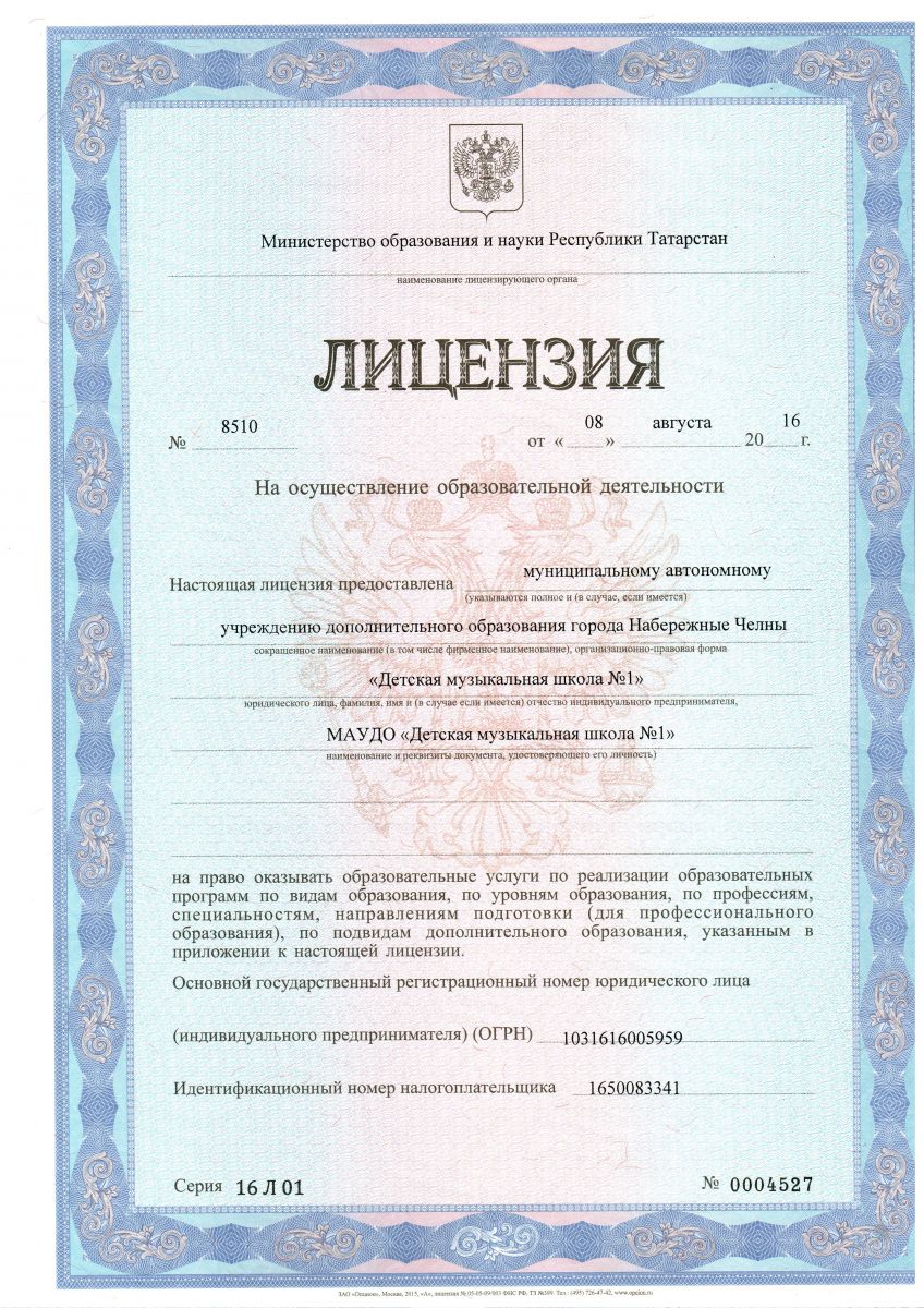 Лицензия на осуществление образовательной деятельности (сторона 1)