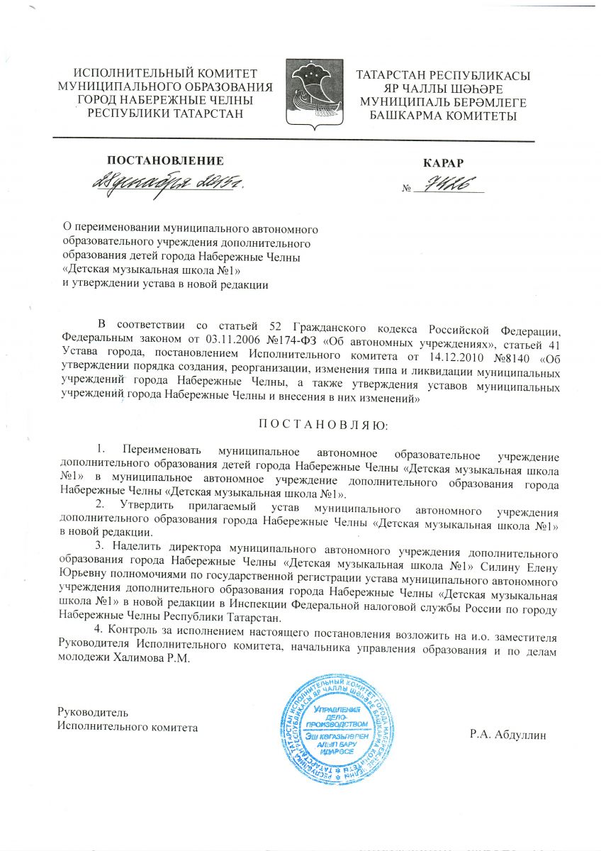 Постановление об утверждении устава ДМШ № 1 и внесении изменений в устав ДМШ № 1