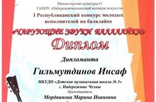 - Гидьмутдинов Инсаф (преп. Мордвинова М.И., конц. Новоселова А.Е.) - дипломант I Республиканского конкурса молодых исполнителей на балалайке "Чарующие звуки балалайки";