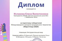 Поздравляем Исламову Елену Валентиновну, концертмейстера Амирову Миляушу Монзиловну и их воспитанников с успешным участием в Международном конкурсе музыкального творчества "Жар-птица 2020". Молодцы!