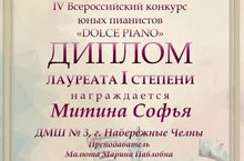 Поздравляем Митину Софью и её преподавателя Малюта Марину Павловну с победой в IV Всероссийском конкурсе юных пианистов "DOLCE PIANO". Отличный результат!
