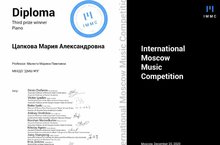Поздравляем с ещё одной значимой победой в International Moscow Music Competition Цапкову Марию и её преподавателя Малюта Марину Павловну. Желаем вам дальнейших творческих успехов!