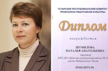 Поздравляем директора ДМШ N°3 Шумилову Наталью Анатольевну с победой в Республиканском конкурсе "Лучший социально-ответственный руководитель в учреждении культуры", в номинации "Руководитель Детской музыкальной школы", учрежденном Татарским республиканским комитетом профсоюза работников культуры.