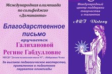 Поздравляем Галиханову Регину Габдулловну с замечательными результатами её учащихся по теоретическим дисциплинам в Международной олимпиаде по сольфеджио "Доминанта".