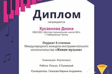 Поздравляем Хусаенову Диану (преподаватель Газизова М.А.) с успешным участием в Международном конкурсе инструментального исполнительства "Живая музыка". Молодец!