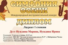 Поздравляем с победой в Международном инструментальном конкурсе "Симфония осени" наш замечательный семейный дуэт: Нуждина Марина и Нуждина Ирина Максимовна.И отдельно поздравляем с успехом Нуждину Марину!