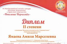 С успехом в VII Международном конкурсе детского,юношеского и взрослого творчества "Поколение Творчества" поздравляем Ямаеву Амилю (преподаватель Гимадиева Г.Н.,конц. Газизова М.А.).