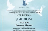Поздравляем с еще одной достойной победой учащуюся ДМШ №3 Нуждину Марину и ее преподавателя Малюта Марину Павловну. Марина участвовала во Всероссийском конкурсе "Смуглянка", посвященном 75-летию победы в ВОВ, и стала обладателем наивысшей награды - Гран-При. Молодец! Гордимся вами! Желаем новых творческих успехов и достижений!