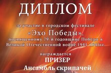 Поздравляем ансамбль скрипачей "Кампанелла" с успешным выступлением на городском фестивале "Эхо Победы", посвящённом 79-ой годовщине Победы в Великой Отечественной Войне. Молодцы!