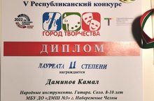 8 декабря в ДМШ N°6 г.Нижнекамск прошли конкурсные прослушивания V Республиканского конкурса " Город Творчества" учащихся народных отделений. Поздравляем Максимову Альфинур Хайдаровну и её воспитанника Даминова Камала, который стал лауреатом 2 степени.