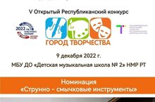 9 декабря в ДМШ N°2 г. Нижнекамск состоялся V Открытый Республиканский конкурс «Город творчества» в номинации «Струнно-смычковые инструменты». С замечательными результатами выступили на конкурсе воспитанники Исламовой Елены Валентиновны.