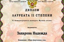 Поздравляем Газизову Марину Андреевну и её воспитанницу Захарову Надежду с успешным участием в VI Международном конкурсе "Музыка весны".