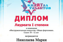Поздравляем Николаеву Марию (кл. преп. Сулеймановой Л.Н.), ставшей Лауреатом I степени в Международном конкурсе-фестивале музыки, культуры и искусства "THE KREMLIN CONFEDERATION OF ART" (г.Казань)!!! Желаем дальнейших творческих успехов и новых побед!!!