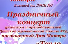 Внимание! 21 ноября в 18.00 ждем мам и бабушек наших учащихся на Праздничный концерт ДМШ №5, посвященный Дню матери "Тепло сердец для наших мам!"