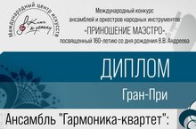 Ансамбль "Гармоника-квартет" - обладатель Гран-при Международного конкурса ансамблей и оркестров народных инструментов "ПРИНОШЕНИЕ МАЭСТРО", посвященного 160-летию со дня рождения В.В.Андреева!