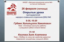 В ДМШ №6 им.С.Сайдашева состоялись открытые уроки и мастер-классы преподавателей струнно-щипкового, народно-клавишного отделения и отделения духовых и ударных инструментов.