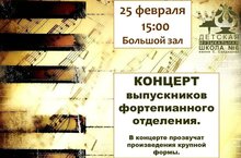25 февраля в 15:00 в Большом зале ДМШ №6 им. С. Сайдашева состоится концерт выпускников фортепианного отделения. В концерте прозвучат произведения крупной формы.