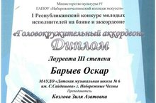 Поздравляем Барыева Оскара (класс преподавателя Козловой З.А.) с призовым результатом в I Республиканском конкурсе молодых исполнителей на баяне и аккордеоне "Головокружительный аккордеон"!