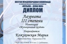 Шестая международная олимпиада по слушанию музыки и музыкальной литературе "Музыка - душа моя", г.Екатеринбург. Кожуховская Мария - лауреат 3 степени в номинации "Музыкальный эрудит".