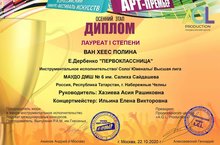 Ученица ДМШ 6 Ван Хеес Полина стала лауреатом 1 степени на Всероссийском конкурсе-фестивале искусств «Арт-Премьер» (г. Москва). Руководитель Хазиева Асия Рашиковна, концертмейстер Ильина Елена Викторовна.