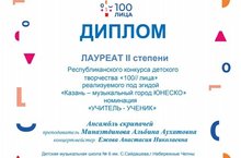 Ансамбль скрипачей ДМШ6 стал лауреатом 2 степени Республиканского конкурса детского творчества "100//лица" под эгидой "Казань-музыкальный город Юнеско" в номинации "Учитель-ученик". Преподаватель Миназтдинова Альбина Аухатовна, концертмейстер Ежова Анастасия Николаевна.