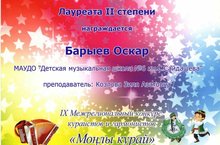 IX Межрегиональный конкурс кураистов и гармонистов «Монлы курай», посвященный композитору кураисту Инберу Шафикову. Набережные Челны. Барыев Оскар Лауреат II степени( преподаватель Козлова З.А.)