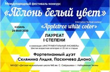 Достижения наших преподавателей: V-й Международный фестиваль-конкурс «Яблонь белый цвет», г.Казань, 24.05.2020г. Фортепианный дуэт:Склямина Лидия, Паскичева Диана ЛАУРЕАТ 1 СТЕПЕНИ в номинации "Инструментальный ансамбль"