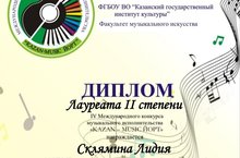 IV Международный конкурс музыкального исполнительства «KAZAN-MUSIC ЙОРТ», Казань 2020 г. Склямина Лидия- ЛАУРЕАТ 2 СТЕПЕНИ, номинация «Фортепиано», категория «Солисты", мастера музыкального искусства. Поздравляем преподавателя фортепианного отделения Склямину Лидию Сергеевну с отличным результатом, желаем новых творческих успехов и побед!!!