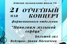 21 мая в Большом зале ДМШ6 прошел отчетный концерт фортепианного отделения "Наполним музыкой сердца". Юные артисты старались порадовать своими талантами слушателей, выступая с сольными и ансамблевыми номерами. Ведущая концерта - Диана Станиславовна Паскичева.