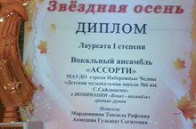 02.11.16г. в ГДТДиМ прошел городской конкурс юных исполнителей "Звездная осень", где вокальный ансамбль"АССОРТИ" стали Лауреатами 1 степени, преп.Т.Р.Мардамшина, конц. Г.С.Ахмедова.