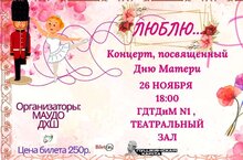 Детская хореографическая школа приглашает на праздничный концерт, посвящённый Дню Матери "Люблю...", который состоится 26 ноября 2024 года в 18:00 в Городском дворце творчества детей и молодежи №1 (театральный зал)