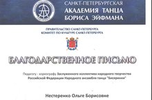Директор СПб ГПБОУ "Академия танца Бориса Эйфмана" выразил огромную благодарность и глубокую признательность нашему преподавателю, Нестеренко Ольге борисовне, за высокопрофессиоанльный подход в развитии физических данных детей. В этом году в академию поступил Карамов Булат.Мы очень гордимся им!