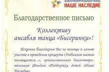 Благодарственное письмо ансамблю танца "Бисеринки" 11.12.2014