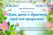 Детская школа искусств приглашает всех желающих 29 августа 2017 года в 16:00 в парк Комсомольский на праздничное мероприятие «Живи, цвети и здравствуй, город мой прекрасный». -