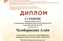 12 ноября 2016 г. в Казанском государственном институте культуры прошел Международный конкурс-фестиваль народного художественного творчества «КУНАКЛАШУ». Чемборисова Алия приняла участие в конкурсе народного художественного творчества и стала Лауреатом I степени. -