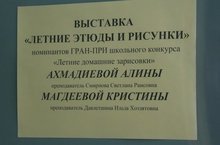 На выставке представлены работы обладателей ГРАН-ПРИ ежегодного школьного конкурса «Летние домашние зарисовки» учащихся художественного отделения Ахмадиевой Алины (ГРПО) и Магдеевой Кристины (8 класс).