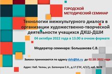 Детская школа искусств приглашает методистов, преподавателей детских художественных школ, детских школ искусств, педагогов дополнительного образования художественной направленности на Городской методический семинар «Технологии межкультурного диалога в организации художественно-творческой деятельности учащихся ДХШ-ДШИ»