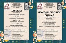 Мы очень рады поздравить двоих наших учеников с высокими наградами! Хуснутдинов Роман стал Стипендиатом Мэра города Набережные Челны, а Марданшин Хасан за успехи в учебе и концертно-конкурсной деятельности по итогам 2020-2021 учебного года был награждён Дипломом управления культуры Исполнительного комитета города Набережные Челны.