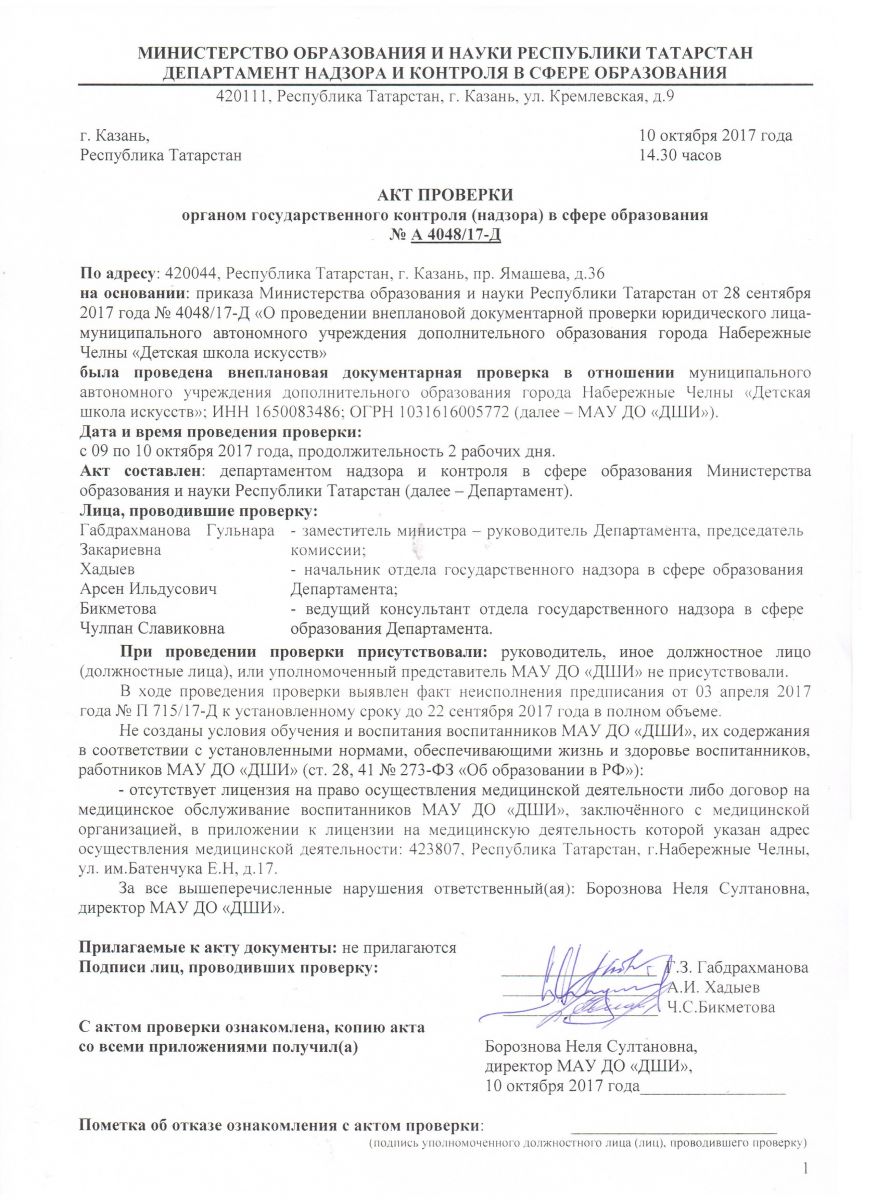 Акт проверки МОиН РТ от 10.10.2017 г. № А 4048/17-Д