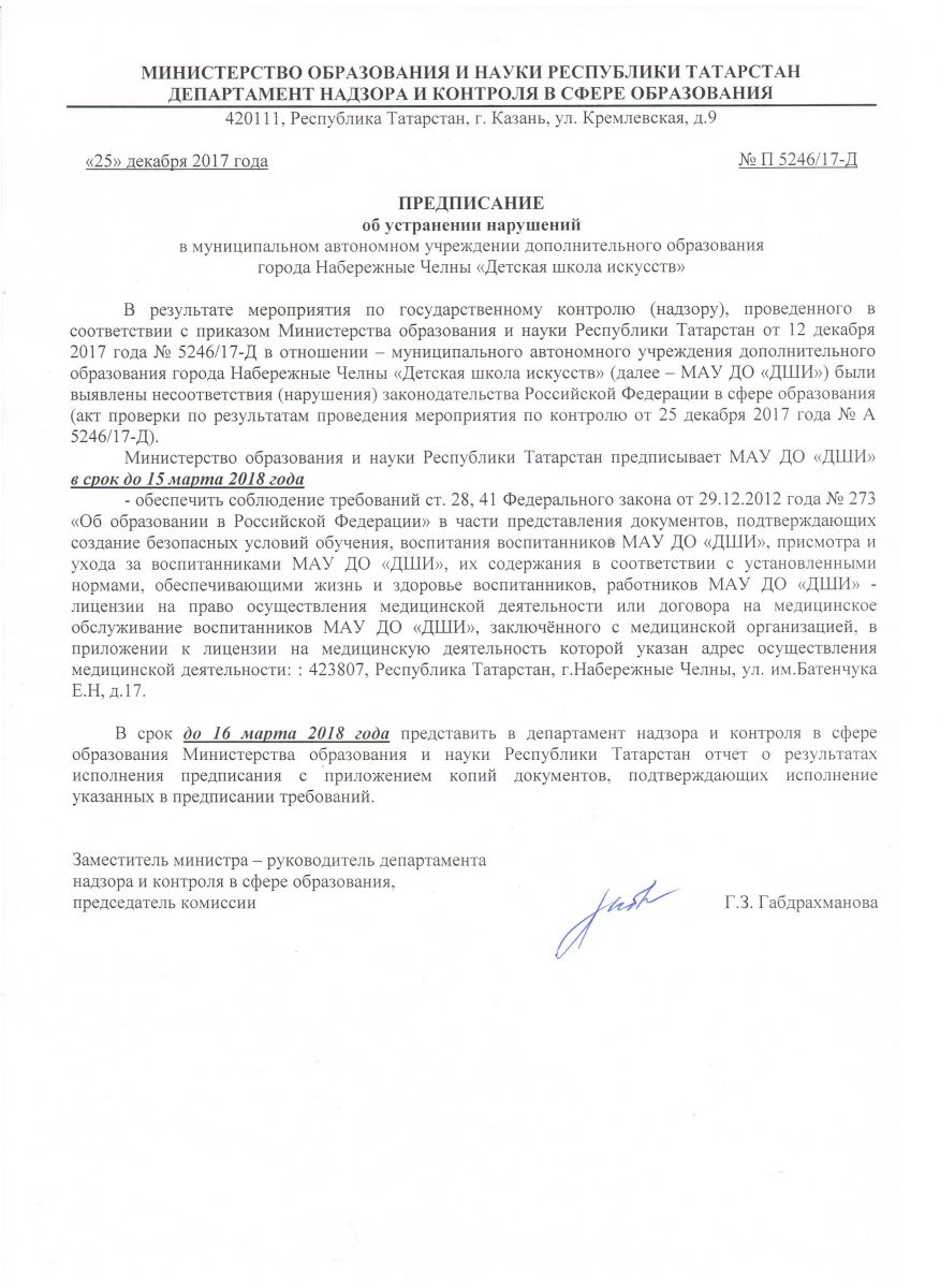 Предписание МОиН РТ от 25.12.2017 г. № П 5246/17-Д