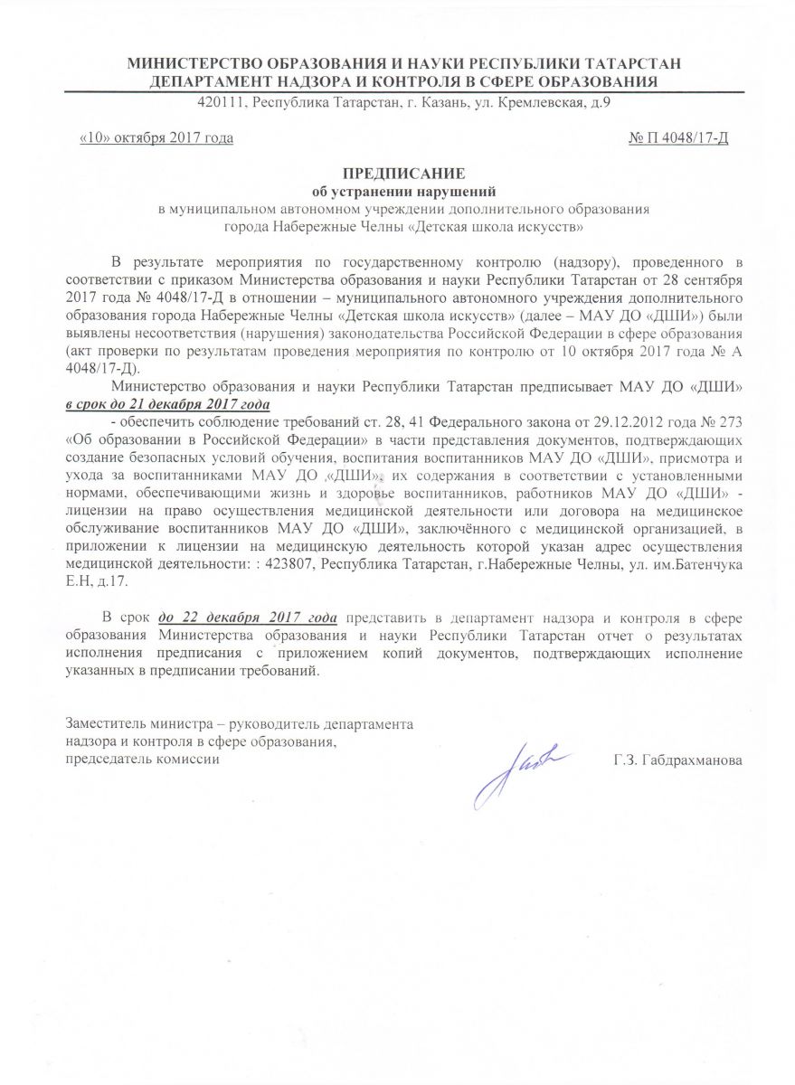 Предписание МОиН РТ от 10.10.2017 г. № П 4048/17-Д