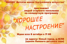 Детская школа театрального искусстваприглашает6 октября в 17:00людей старшего поколенияна концертную программу"Хорошее настроение"Ждём всех по адресу: Новый город, д.18/08(здание бывшего детского сада) -