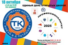 18 октября 2025 года Технический колледж им. В.Д. Поташова приглашает на Единый день открытых дверей ФП "Профессионалитет".
