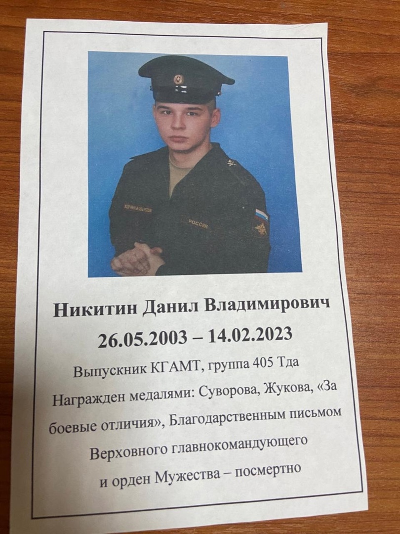 Никитин Данил Владимирович 26.05.2003 - 14.02.2023. Выпускник КГАМТ, группа 405 Тда. Награждён медалями: Суворова, Жукова, "За боевые отличия", Благодарственным письмом Верховного главнокомандующего и орден Мужества - посмертно!