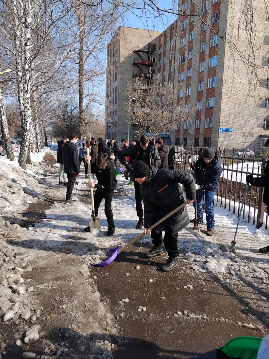 Студенты собрались вместе, чтобы убрать лед! Благодаря их труду территория техникума стала чище и аккуратнее.