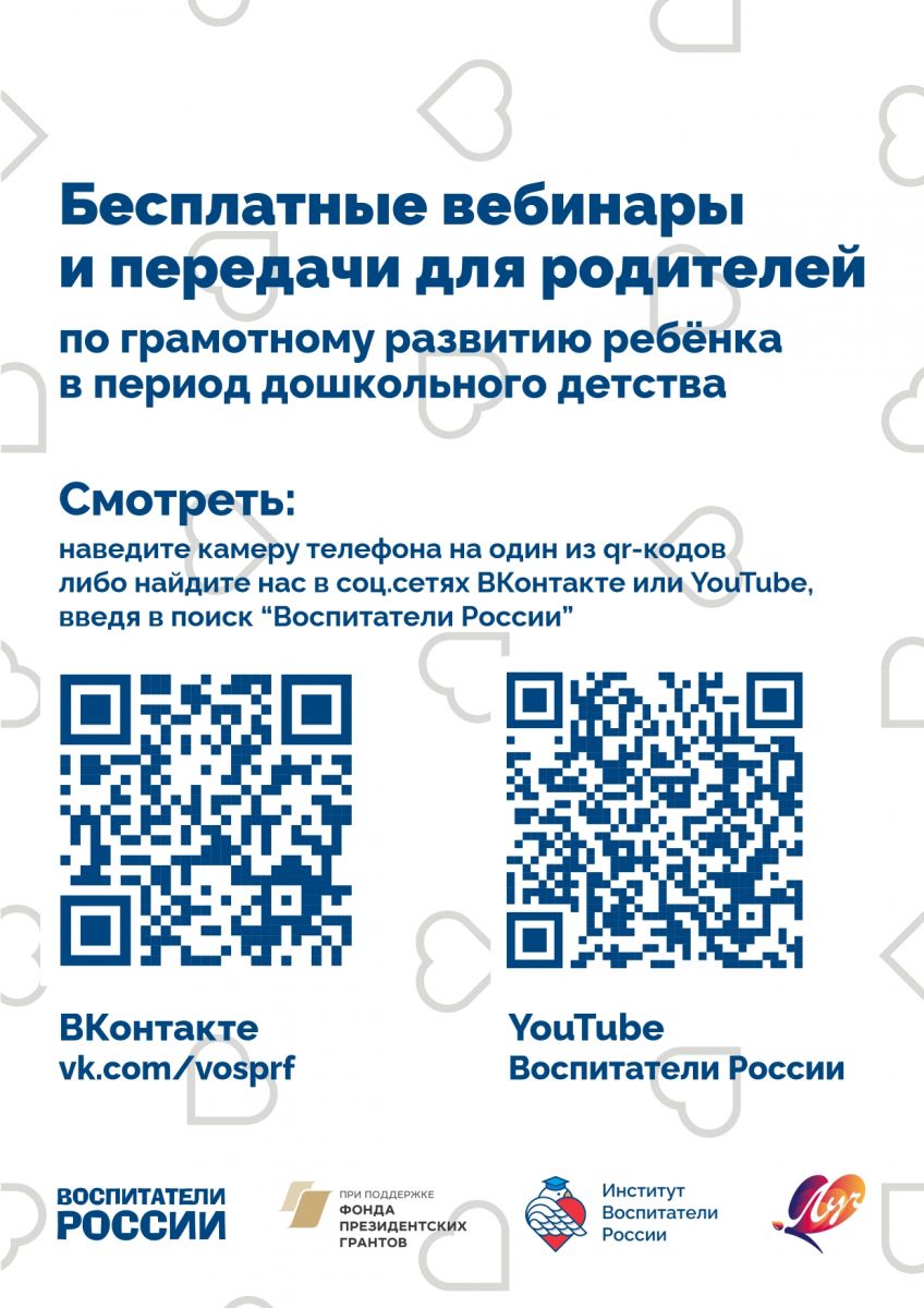 Опубликовано: 17.10.2022ВОО «Воспитатели России» совместно с лучшими экспертами по дошкольному образованию – руководителями Инновационных площадок «Воспитатели России» и при поддержке Фонда президентских грантов подготовили серию вебинаров и передач для родителей по грамотному развитию ребёнка в период дошкольного детства. Приглашаем вас, уважаемые родители, ознакомиться с содержанием вебинаров и передач.