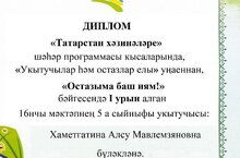 "Татарстан хәзинәләре" шәһәр прогарммасы кысаларындв "Укытучылар һәм остазлар елы" уңаеннан "Остазыма баш иям!" бәйгесендә 1 нче урын алган 5А сыйныфы җитәкчесе Хаметгатина Алсу Мәүлемҗан кызын чын күңелдән тәбрик итәбез.
