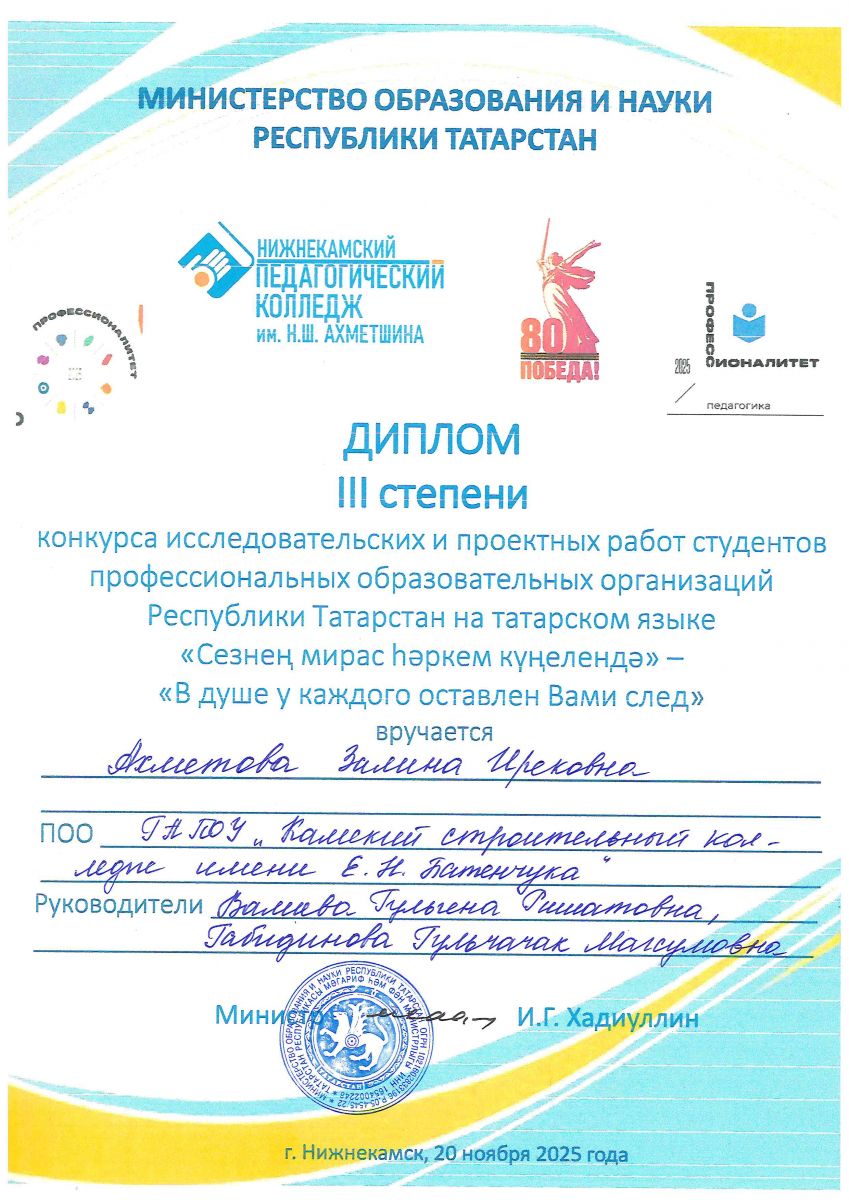 20 ноября 2025 года на базе ГАПОУ «Нижнекамский педагогический колледж им. Н.Ш. Ахметшина» состоялся конкурс исследовательских и проектных работ студентов профессиональных образовательных ораганизаций Республики Татарстан на татарском языке «Сезнең мирас һәркем күңелендә» – «В душе у каждого оставлен Вами след».